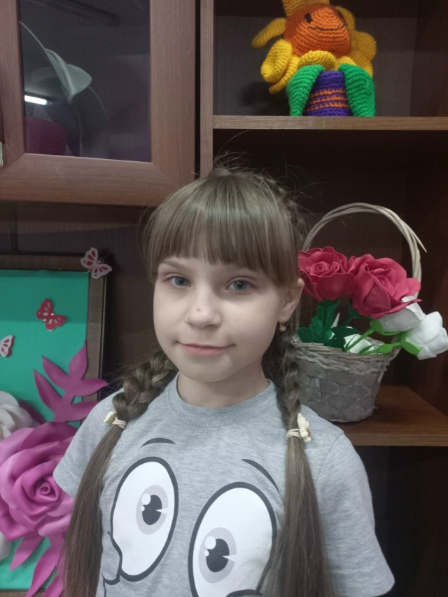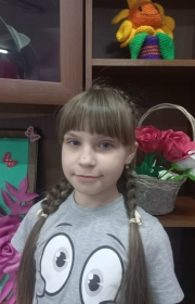 Очень активная, подвижная девочка. Ласковая, общительная. Любит рисовать, делать поделки из бумаги и картона. Любит играть в куклы и мягкие игрушки.
